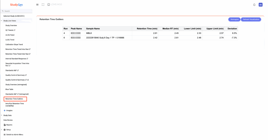„Instead of charts, I want to see all data in a single table for all the runs. Only include the samples where the retention time is greater or less than 5% of the median for that run. Add the median and upper/lower limits for the run in the table too, and add the sample name.“