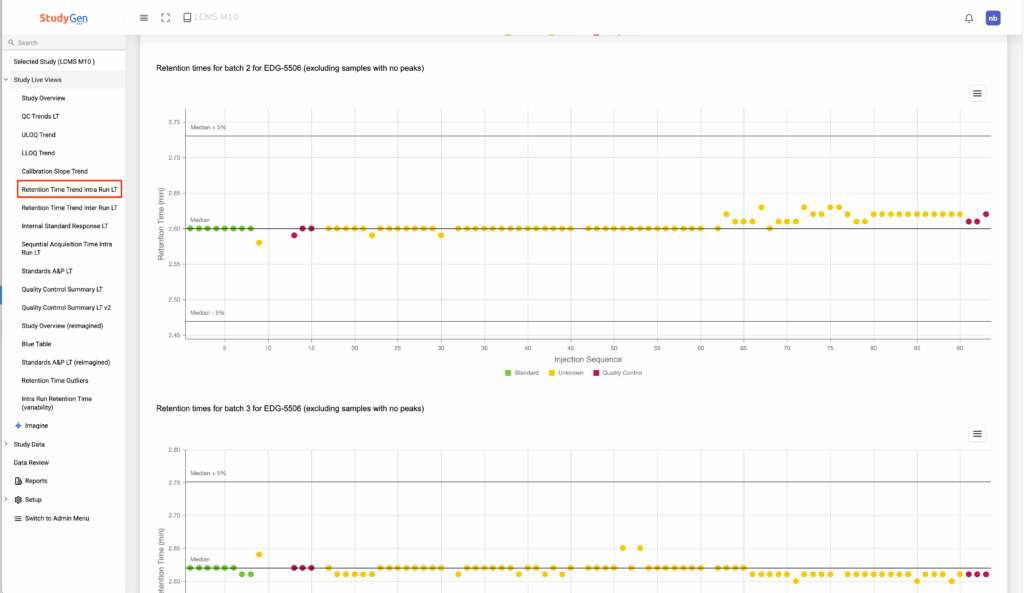 The app is already giving an analysis on “Retention Times”, but this is a too detailed analysis with plots of the retention times of all samples within a run for all runs of the study: